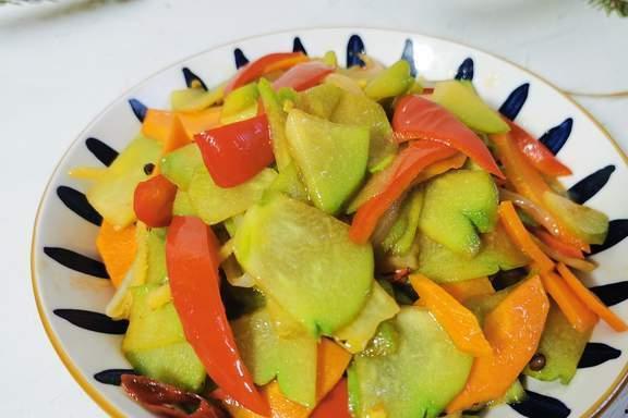 将佛手瓜洗净切片,锅中加入适量油,放入蒜末爆香,再加入佛手瓜片翻炒至断生,最后加入适量盐、鸡精调味即可。